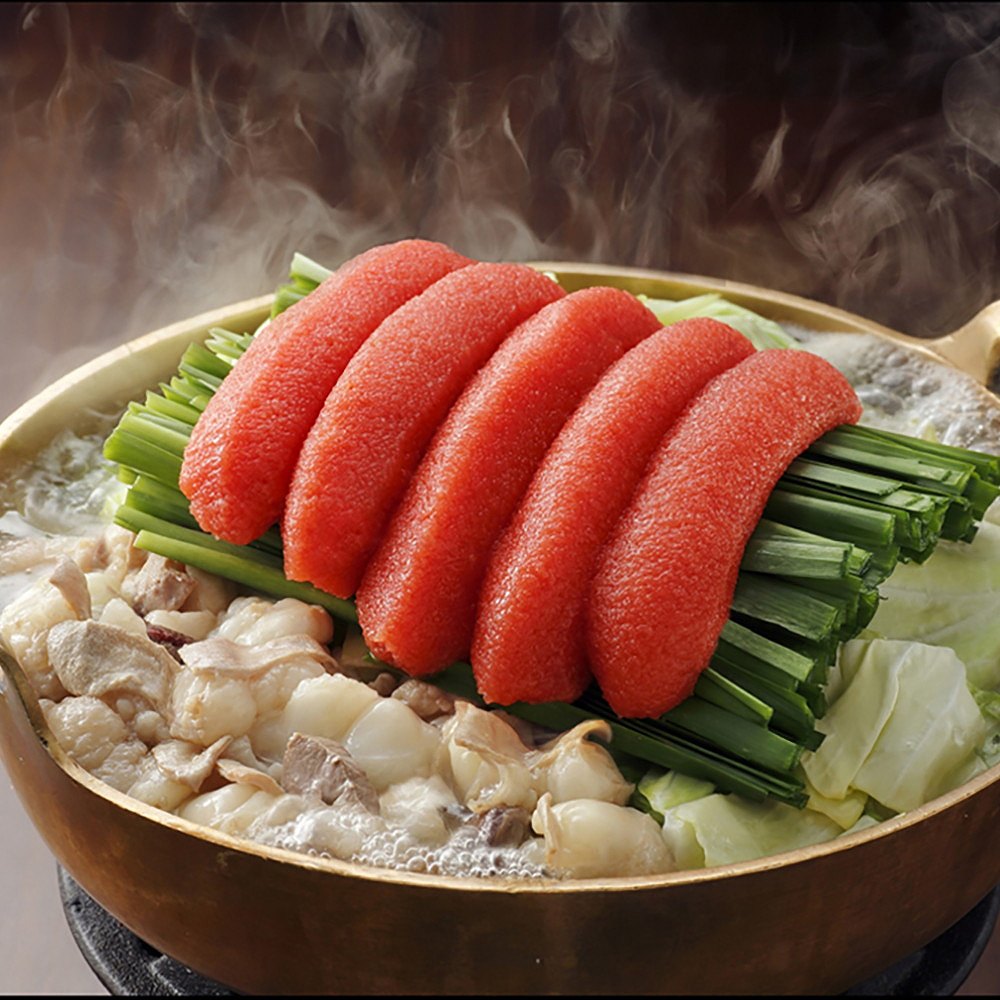 ■かねふく直営の九州料理店「築地ふく竹」の人気の鍋。来店客の9割以上が注文する名物をご自宅用にご用意しました。たっぷりの明太子がスープに溶け出し、プリプリの牛もつの旨味を引き立てます。
