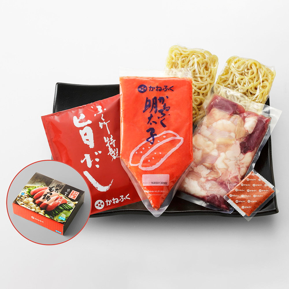 牛もつ(国産)300g、明太子ばらこ(米国又はロシア)300g、濃縮だし(2倍希釈)400g、ちゃんぽん麺180g×2玉、唐辛子5g