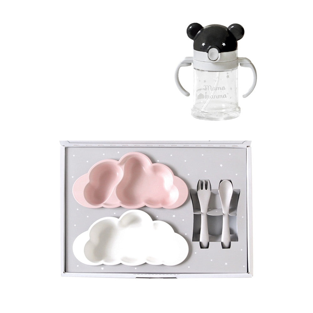 ■お食事が楽しくなるかわいい雲形のプレートは、ごはんをすくいやすい設計で、離乳食のスタートにぴったり。赤ちゃんの手に馴染むカトラリー付きです。8カ月頃から使用できる飲み口が柔らかいストローマグもセットに。