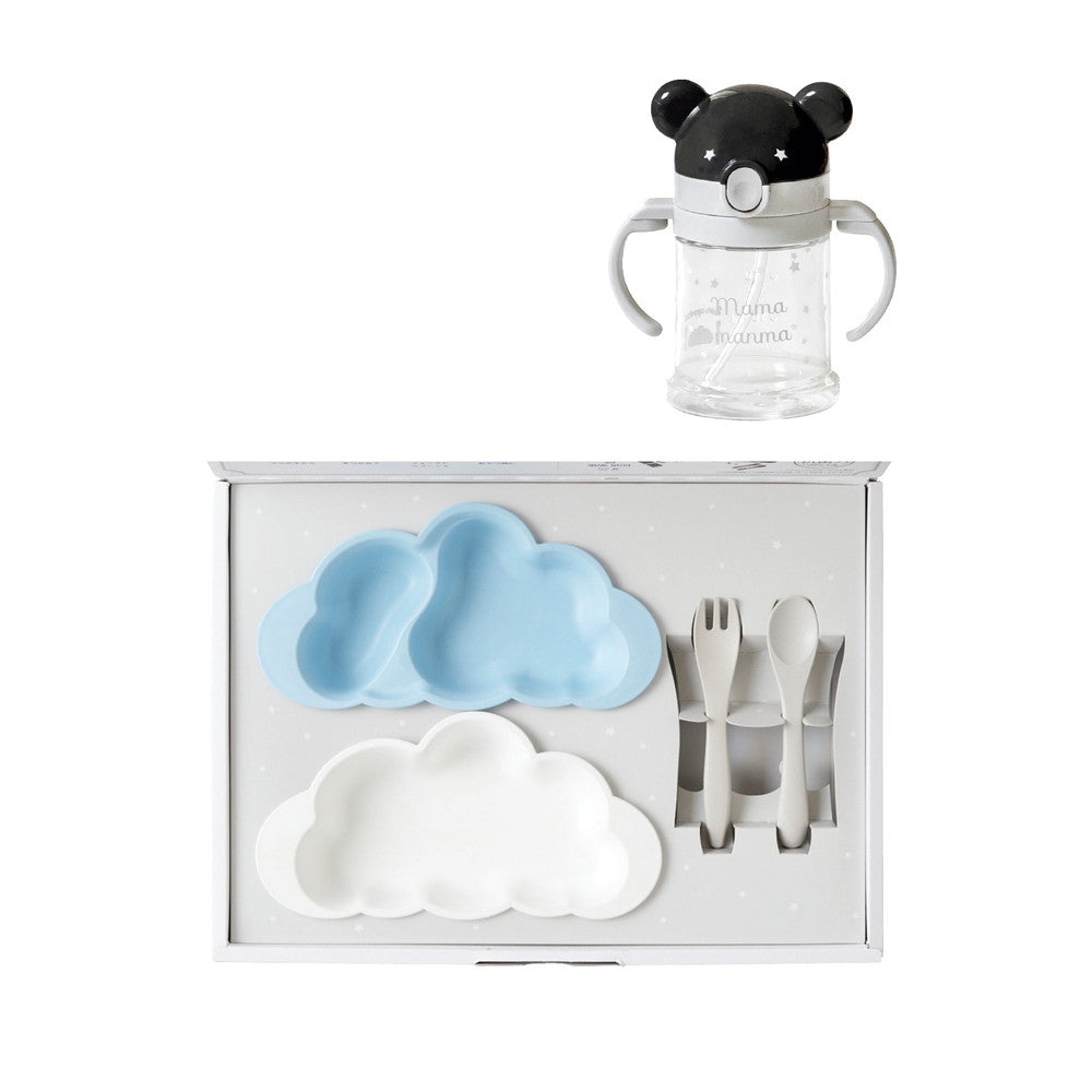 ■お食事が楽しくなるかわいい雲形のプレートは、ごはんをすくいやすい設計で、離乳食のスタートにぴったり。赤ちゃんの手に馴染むカトラリー付きです。8カ月頃から使用できる飲み口が柔らかいストローマグもセットに。