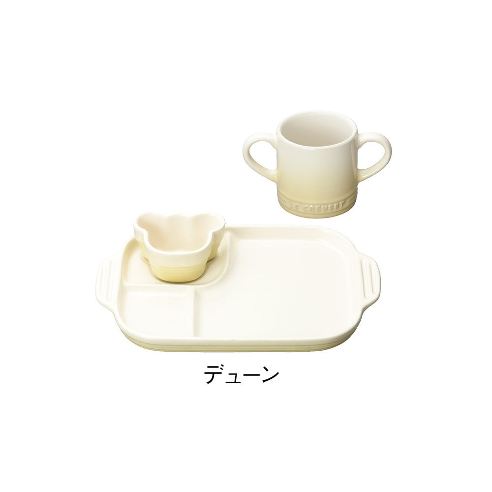 ■ワンプレートで盛り付けができる仕切り付きのお皿です。クマのラムカンは離乳食やデザートの器として、また抜き型としてもお使いいただけます。両脇に持ち手がついた小さなマグカップはお子さまの手にぴったり。