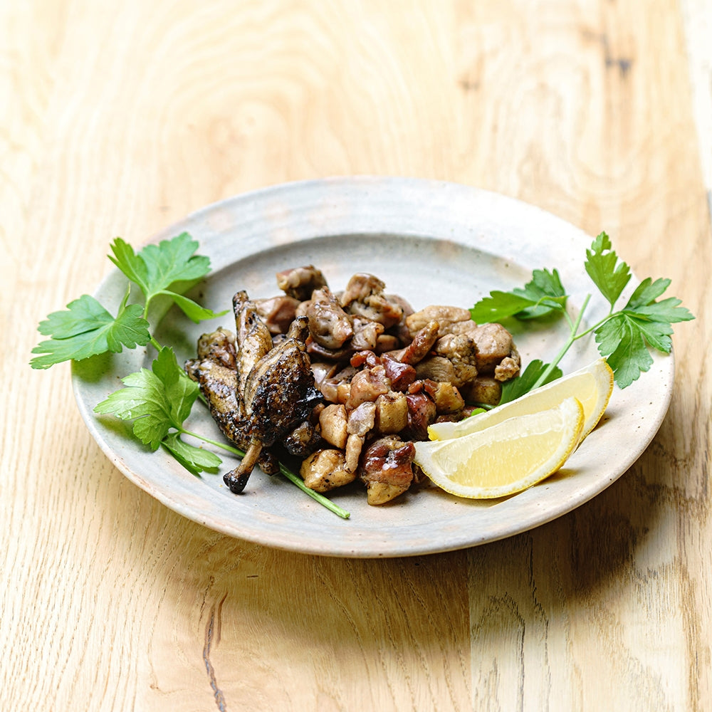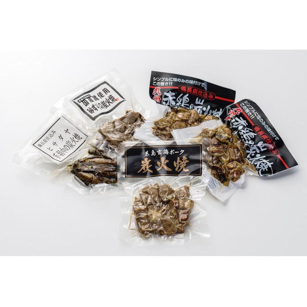 ■内容量:九州産赤鶏の炭火焼95g×2、福岡県産玄海ポークの炭火焼80g、九州産砂肝の炭火焼80g、九州産手羽中の炭火焼80g