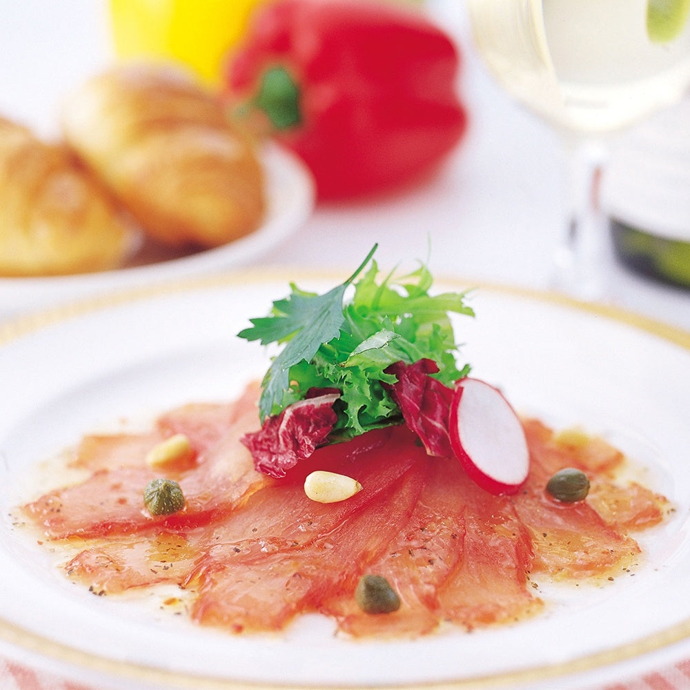 まぐろを生ハムに仕立て、スライスしました。しっとりとした食感に燻の薫りが広がります。 オードブル感覚でお召し上がりください。