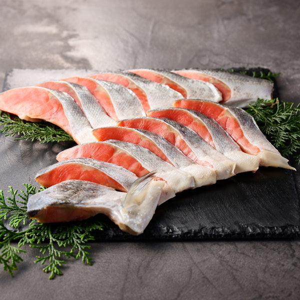 ■色鮮やかで脂ののったロシア産の紅鮭を塩水に一晩漬込み、さらに低温で二晩じっくり熟成させました。切身を一切ずつ真空包装しているため、保存も解凍もしやすく便利なお品。しっとりとやわらかい甘塩仕立ての塩紅鮭をお楽しみください。