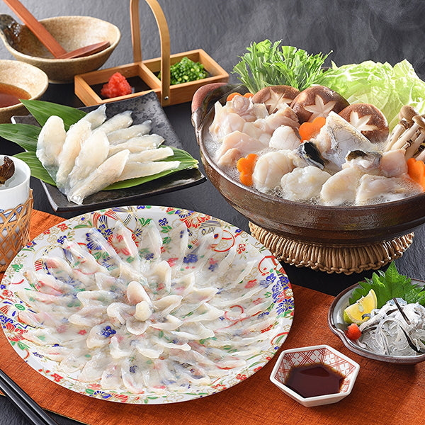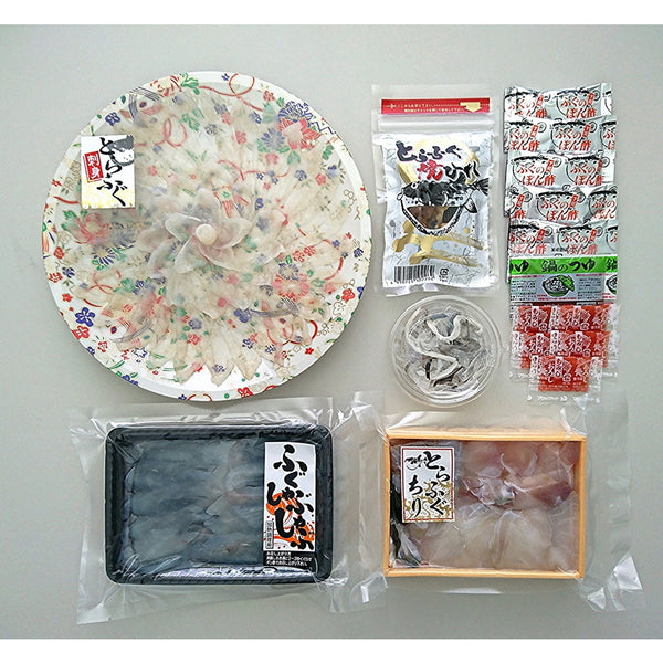 ■商品内容:とらふぐ刺身70g(プラスチック皿)、とらふぐちり200g、まふぐしゃぶ50g、とらふぐ皮刺20g、とらふぐ焼ひれ3g、鍋のつゆ20g、ぽん酢15g×5、もみじおろし3g×5