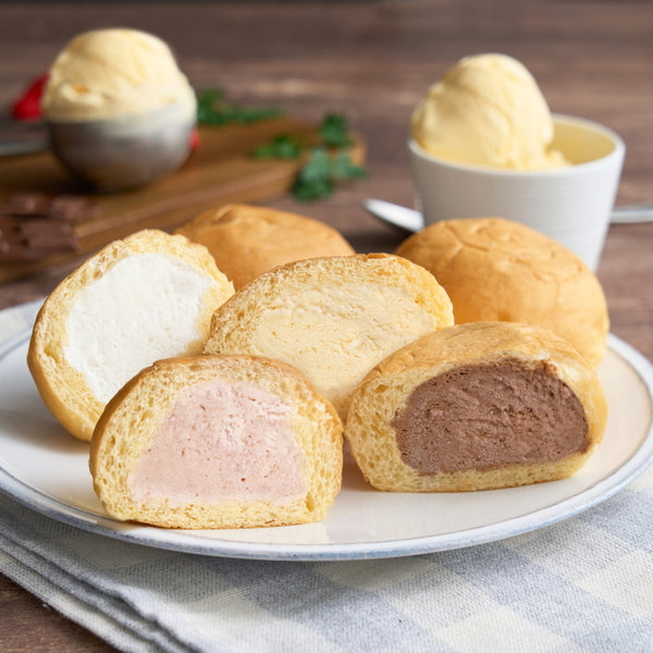 ■まるでアイスのような新感覚のくりーむパンは、特製のクリームで凍ったまますぐにお召し上がりいただけます。カスタード、チョコレート、あまおう苺、ミルクの4種類の味が楽しめます。