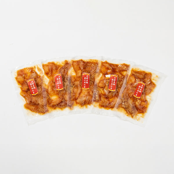 ■九州産の天然真鯛を手早く捌き、丼ぶり用の切身に切り分け醤油ベースの独自のたれに絡めて真空パックし、鮮度の良いうちにリキッドフリーザーを使った急速冷凍技術により凍結しました。封を開けたら新鮮なままの天然真鯛のぷりぷりの食感と旨みを贅沢に丼ぶりでお召し上がり頂けます。最後はお茶漬けでもどうぞ。