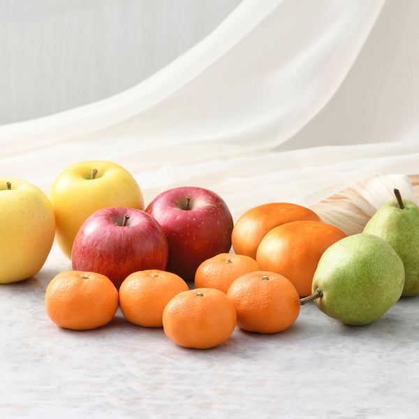 ■冬を代表する果物5種を詰合せました。赤と青2色のりんごに、人気を誇る洋梨ラ・フランス、愛媛の絶品フルーツ紅まどんな(又は、見ためも美しい九州産のハウス不知火)、名産地静岡の三ヶ日みかんのセットです。