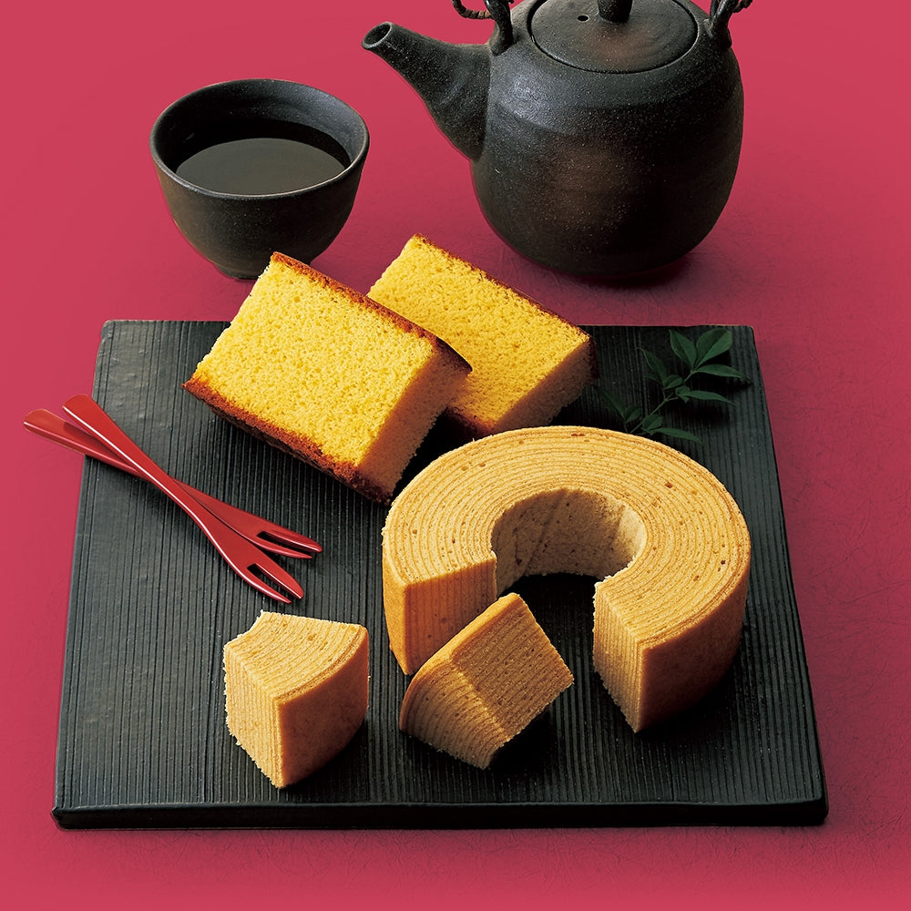 貴重な烏骨鶏卵を使用したふんわりもっとりとした黄金色のかすてらと、しっとりバウムクーヘンのセットです。