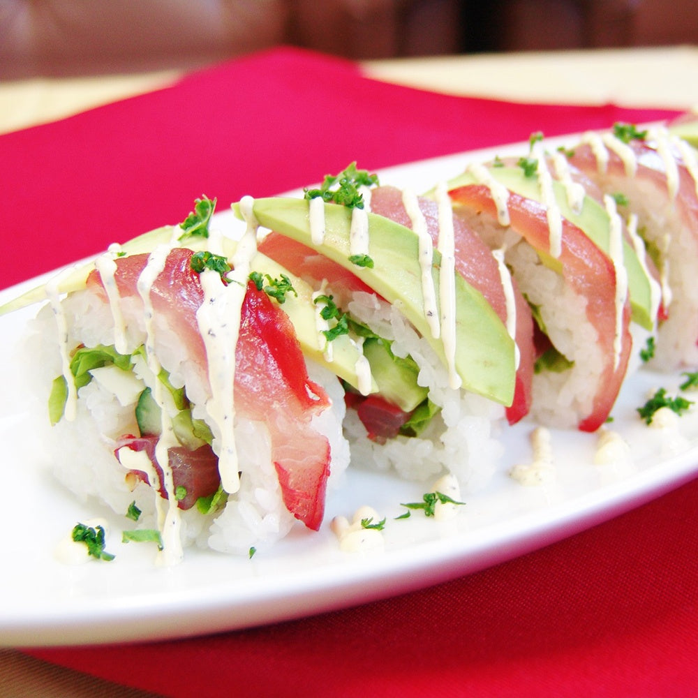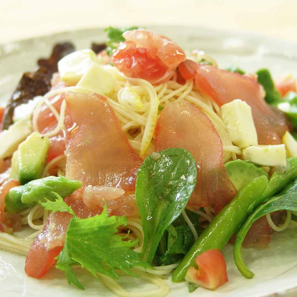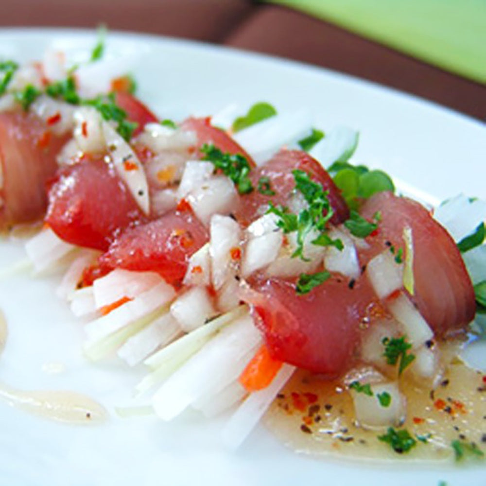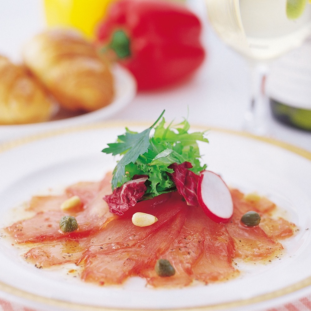 オードブルのメニューとしても人気の高い生ハムを、まぐろで作りました。しっとりとした食感に燻製の薫りが広がります。