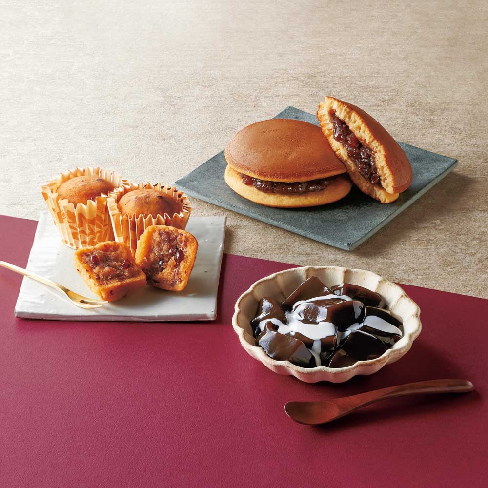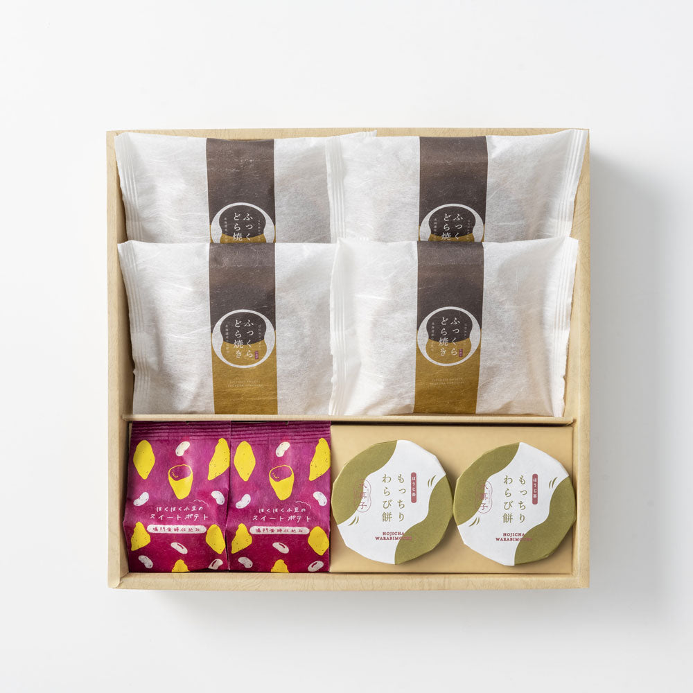 ■商品内容:ふっくらどら焼き×4個、もっちりわらび餅×2個、ほくほく小豆のスイートポテト×2個 計8個入り