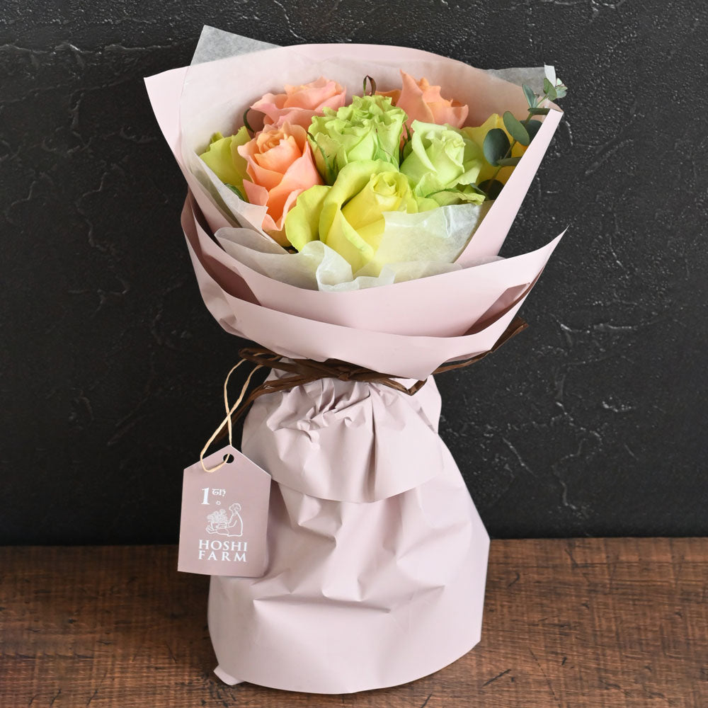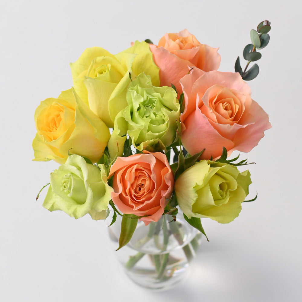 ■商品内容:お任せバラ(オレンジ・イエロー・グリーン系)×8本、栄養剤10ml(50倍希釈タイプ)、お手入れのしおり付き