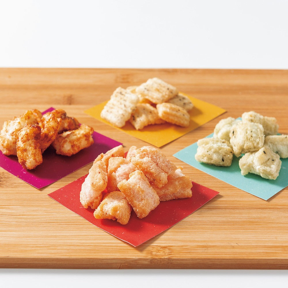 ■京都亀岡で創業74年の保津川のあられ本舗が昔ながらの製法で作る、お米の香りがする「ほんもの」のあられ。きめが細かく、粘りのある食感が特徴の佐賀県産ヒヨクモチを使用して、健康や美容に良いとされる米油で1つ1つ丁寧に揚げ、香り豊かな4種のフレーバーに仕上げました。京の職人がこだわり続ける、「お米の香りがするあられ」をお楽しみください。