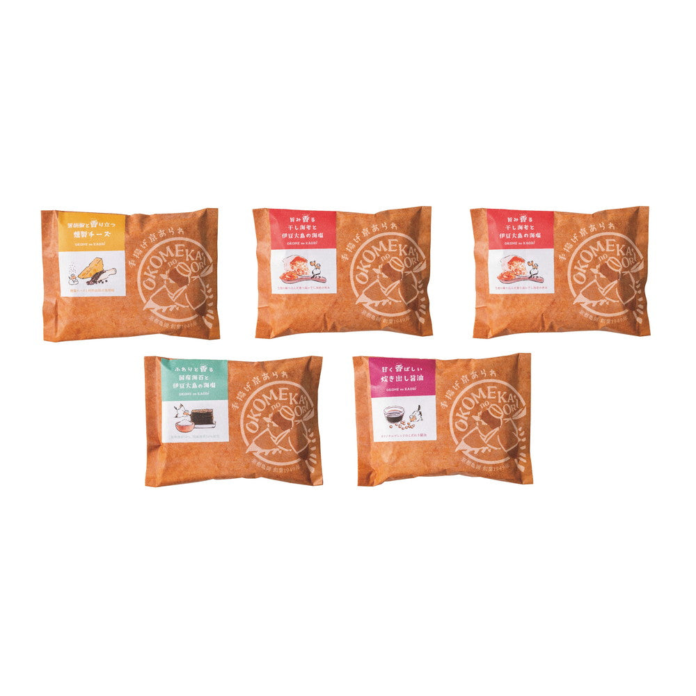 ■商品内容:手揚げ京あられ9粒入×5袋(旨み香る干し海老と伊豆大島の海塩×2袋、甘く香ばしい炊き出し醤油・ふわりと香る国産海苔と伊豆大島の海塩・黒胡椒と香り立つ燻製チーズ×各1袋)
