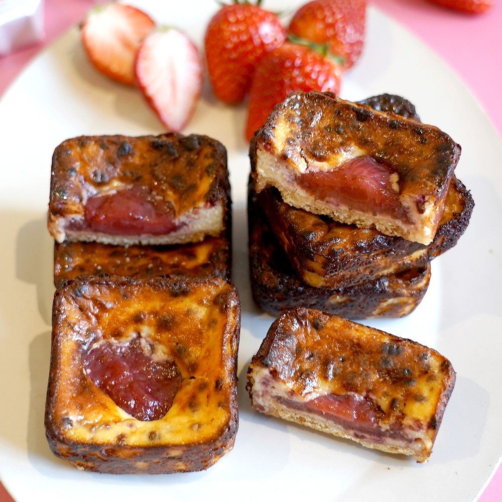 濃厚なデンマーク産クリームチーズをたっぷり使い、 高温で香ばしく焼きあげた手のひらサイズのバスクチーズケーキに国産いちごをまるごと1粒のせました。
