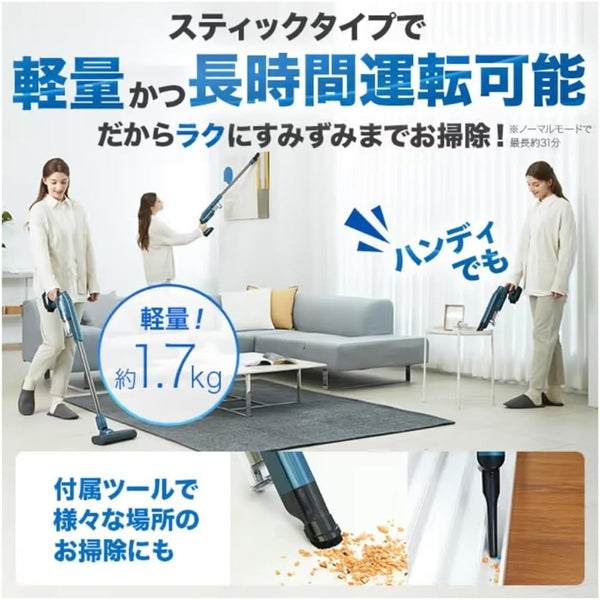 ■約1.7kgの軽量ボディ。しかもノーマルモードならば最長約31分の運転が可能。ハンディに切り替えるだけで、 一度にさまざまな場所を掃除可能。