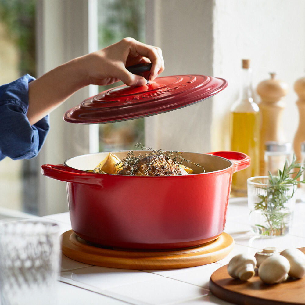 「ココット・ロンド」はル・クルーゼを代表する鋳物ホーロー鍋。煮る、炊く、蒸す、焼く、炒める、揚げる、さまざまな調理法が1つで出来る万能なお鍋です。ガス・直火、IHクッキングヒーター、ハロゲンヒーターはもちろん、オーブンにも対応しています。