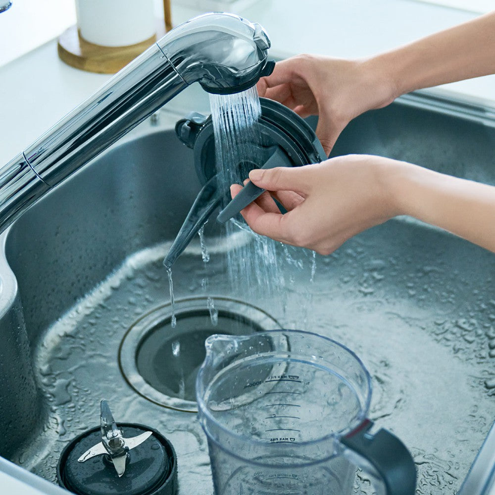 ピッチャー、フタ、ブレードユニットは取り外せるのでお手入れも簡単。洗剤と水をかくはんすることで、細かな部分も清潔に。