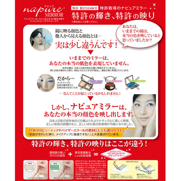 しかし、ナピュアミラーは特許取得の透明度の高いガラスと特殊反射金属加工により、自然でより純粋な色が表現でき、ガラスの色に影響されない正確な色再現により肌本来の色を素直に映し出します。