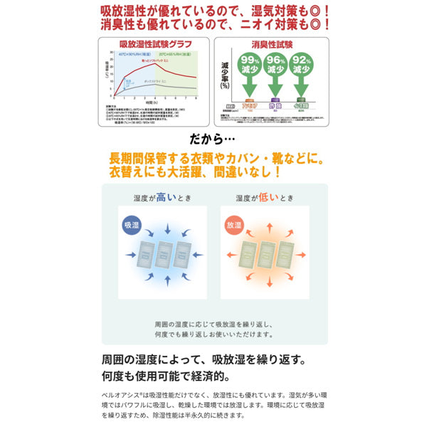 周囲が高湿度の時に吸湿し、低湿度の時に放湿する特性があるため、使い捨てではなく何度も使えて経済的です!
