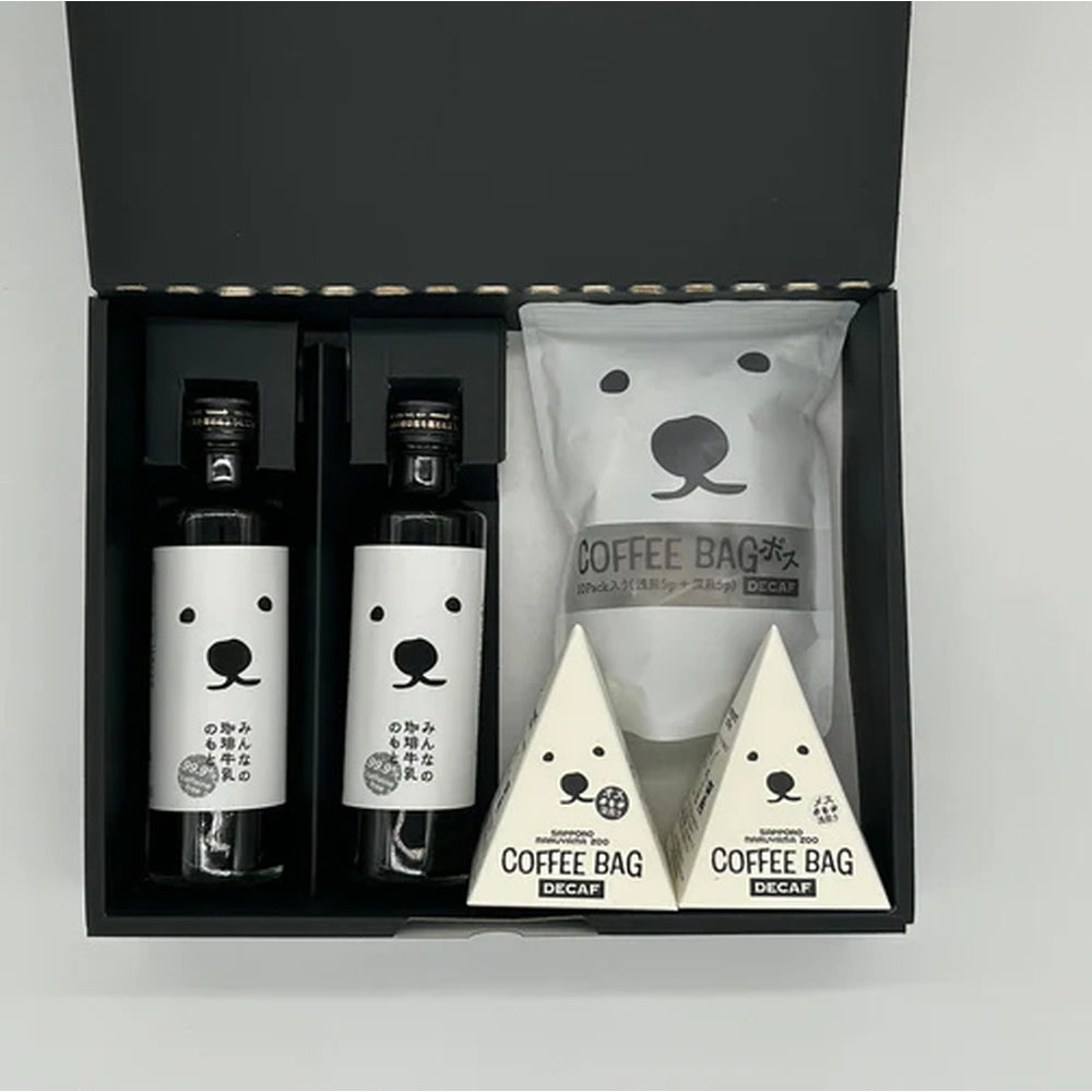 ■商品内容:デカフェ専門イノセントコーヒー シロクマカフェ デカフェセット(コーヒーバッグ3種+珈琲牛乳のもと無糖2本)