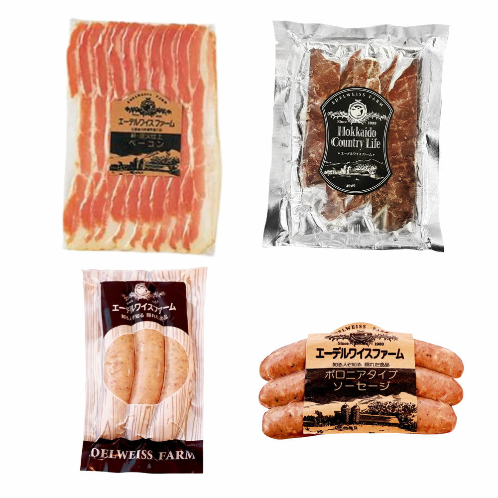 ■商品内容:北海道・誕生90余年 長期氷温熟成製法 「エーデルワイスファーム」薪・炭火仕上げべーコン・ソーセージギフト B