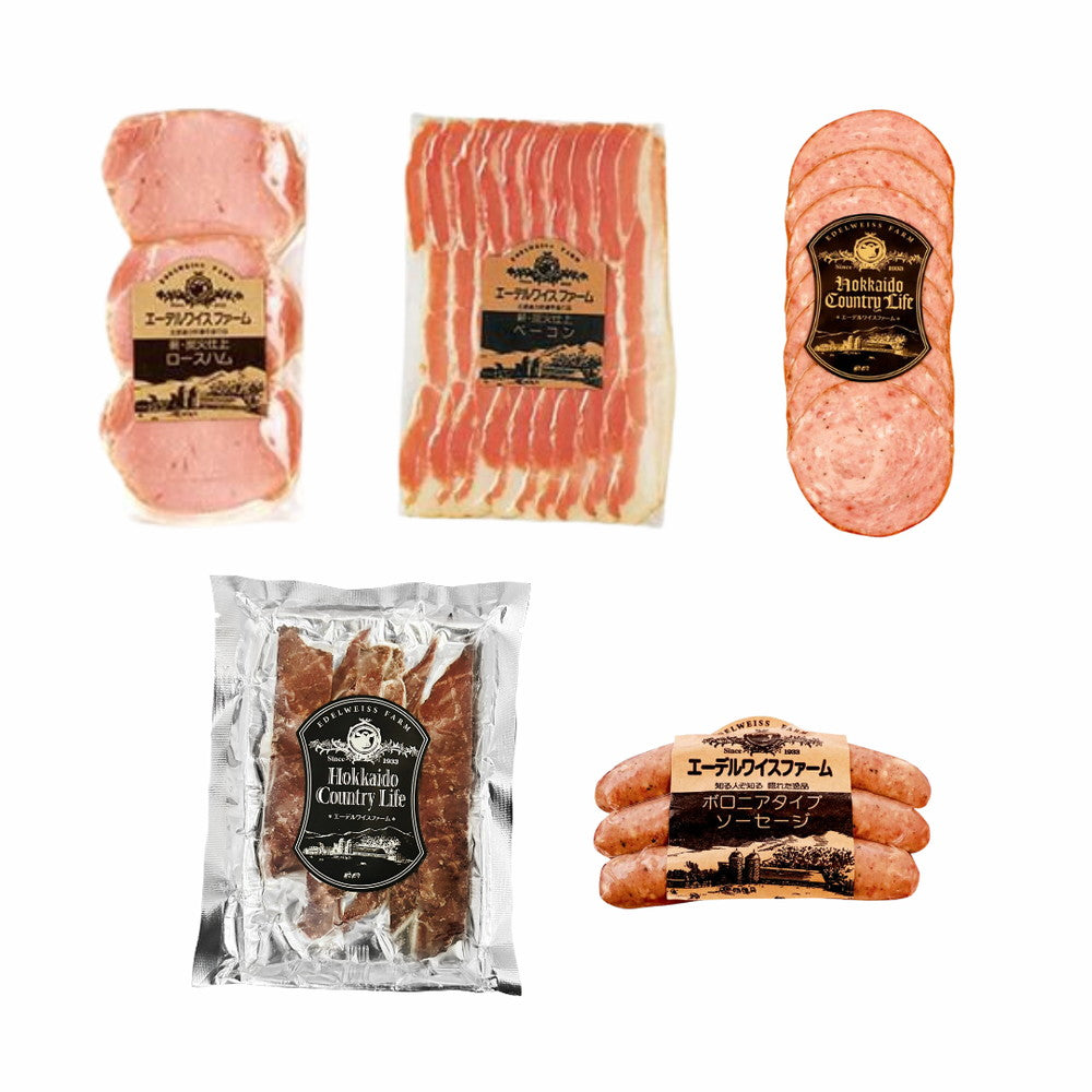 ■商品内容:北海道・誕生90余年 長期氷温熟成製法 「エーデルワイスファーム」薪・炭火仕上げべーコン・ソーセージギフト C