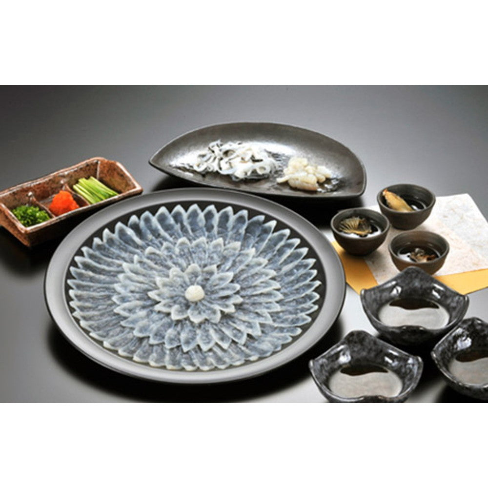 ■内容量:とらふく刺身105g(プラスチック皿30cm)、とらふく皮40g、ひれ酒用ヒレ5枚、ポン酢35g×4、モミジオロシ16g、塩5g、カボス果汁2ml×4