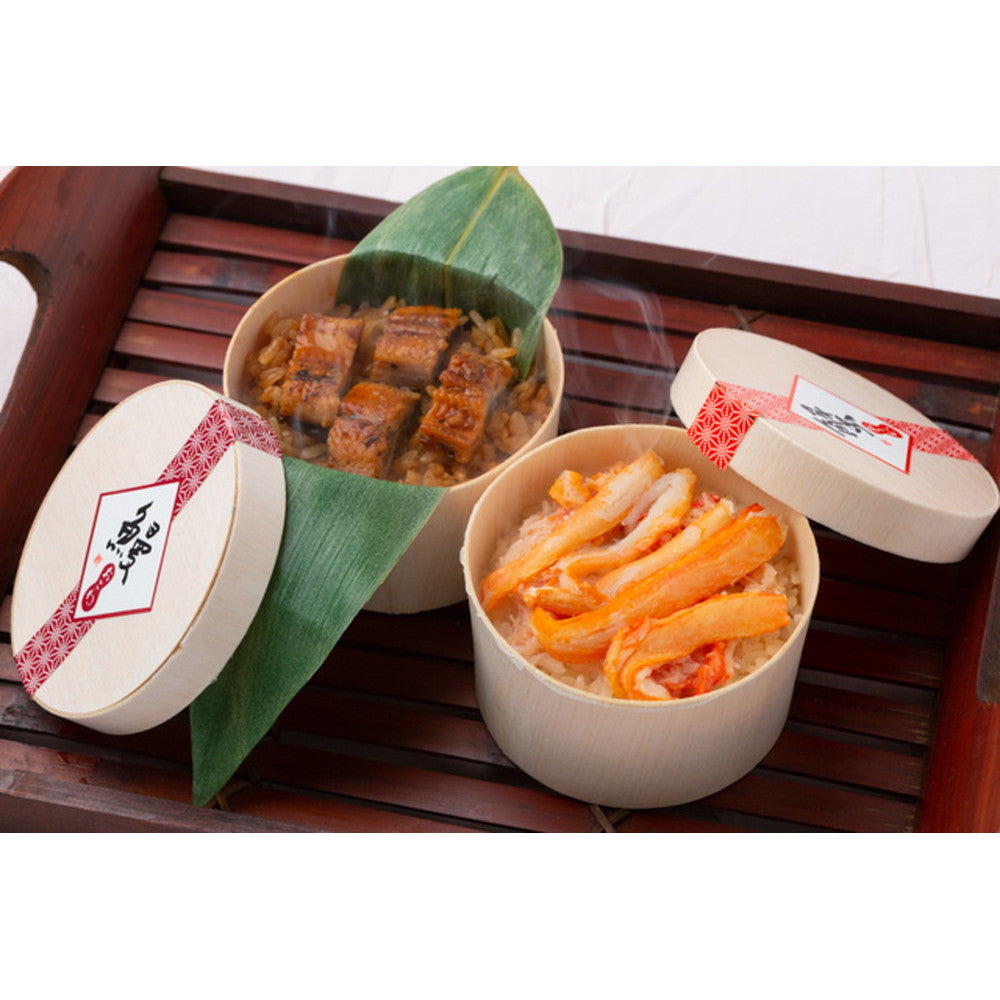 うなぎおこわは、モンドセレクション金賞を受賞した、ふっくらご飯に笹の葉が香り、うなぎ蒲焼きの旨味が広がる、ちょっとリッチなわっぱご飯です。「かにおこわ」は、日本海で獲れた鮮度抜群な「ベニズワイガニ」をふんだんに使用。カニの旨味をたっぷり入れた当社特製の白だしで炊き上げたおこわに丁寧にほぐしたカニ身をふんだんにふりかけ、更に贅沢にカニのむき身をトッピング。贅沢なカニの旨味と魚介やこんぶ、シイタケの旨味だしがおこわにしみわたっています。