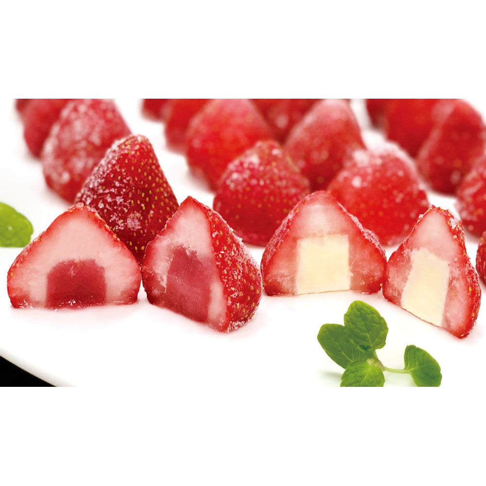 九州産の上質な苺(さがほのか)を使用したいちごアイス。新鮮な苺の芯を丁寧にくり抜いて苺と相性の良い2種類のアイスを搾りいれました