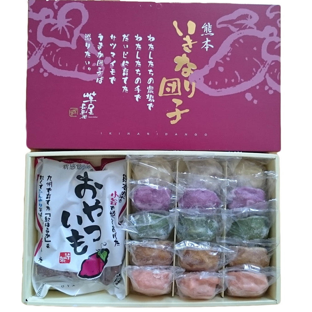 熊本名物「いきなり団子」ホクホクのさつま芋とコクのある餡をモチモチした特製生地で包んだ郷土の素朴なお団子です。今回は、冷凍のままや半解凍、自然解凍でアイス・シャーベット感覚でお召し上がりいただける新食感の冷凍焼芋「おやついも(新感覚冷凍焼き芋)」をセットにしました。