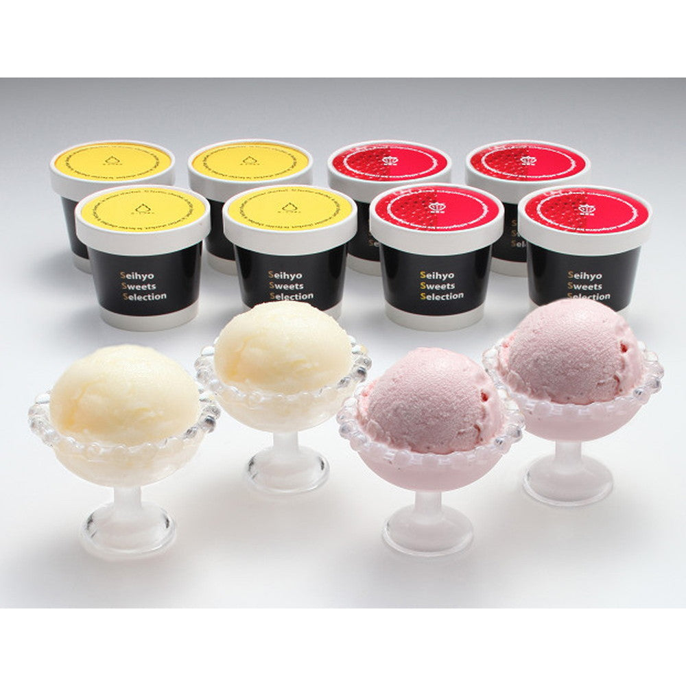 新潟の特産品の一つにあげられる西洋梨「ル レクチエ」を使用したなめらかな食感で香り高く仕上げたシャーベット、新潟県産のいちご(越後姫)を相性の良い練乳と混ぜ、素材の良さを生かした甘くて、コクのあるアイスクリームの嬉しい2種詰合せです。