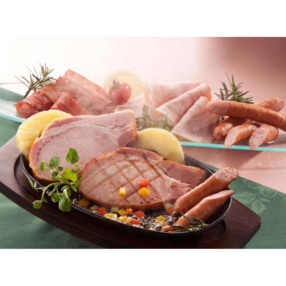 ■内容量:スモーク生ハム60g、ロースハムスライス110g、あらびきウインナー130g(5本入)、ブラートブルスト120g(5本入)、ボンレスハム110g