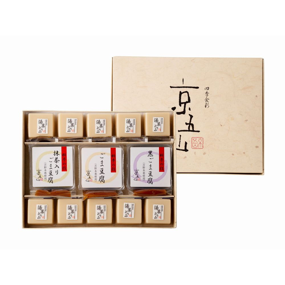 京都 北野天満宮傍の胡麻豆腐専門店「京五山」の胡麻豆腐と湯葉どうふの詰合せです。【ごまとうふ】薬品を使わず皮を取り除いた、味わい深く香り高い胡麻と厳選した葛粉を練り上げ、もっちりした食感に仕上げました。定番の白胡麻・黒胡麻に加え、京都 宇治抹茶を練り込んだ抹茶入りの3種類を詰め合わせました。【湯葉どうふ】搾りたての豆乳と厳選した葛粉を絹のようになるまで練り上げ、滑らかでコクのある"湯葉豆腐"に仕上げました。
