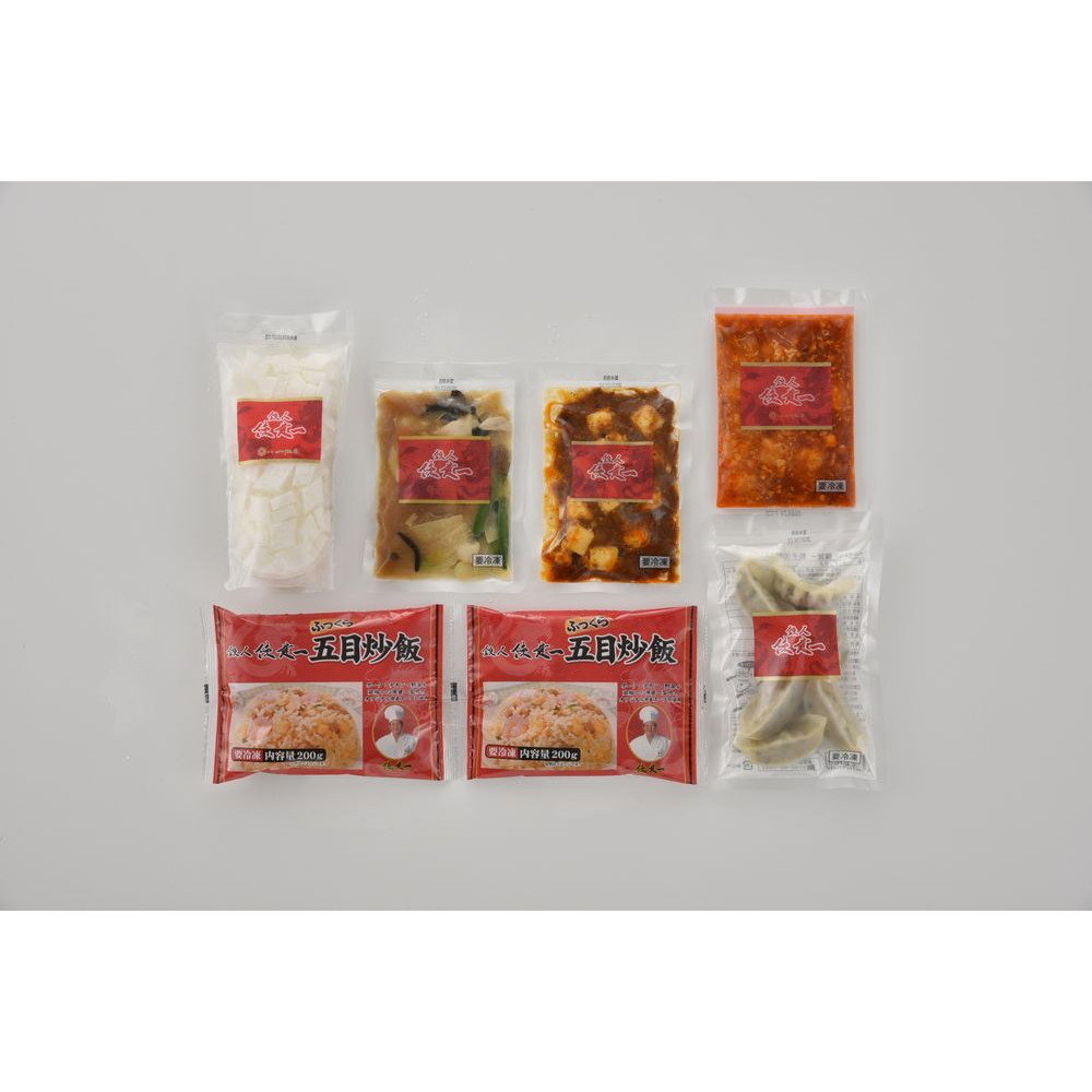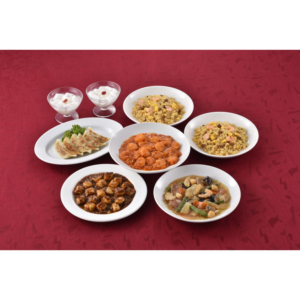 ■内容量:餃子120g(6個入)×1、本格四川麻婆豆腐150g×1、乾焼蝦仁(エビチリソース)150g×1、本格八宝菜150g×1、ふっくら五目炒飯(200g×2)×1、杏仁豆腐500g×1