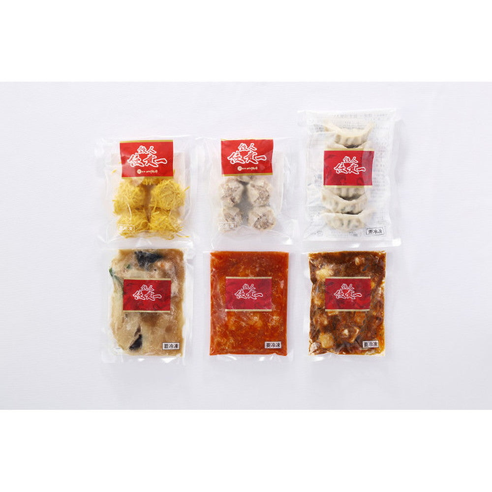 ■内容量:餃子120g(6個入)×1、貝柱入焼売150g(5個入)×1、錦糸焼売125g(5個入)×1、乾焼蝦仁(エビチリソース)150g×1、本格四川麻婆豆腐150g×1、本格八宝菜150g×1
