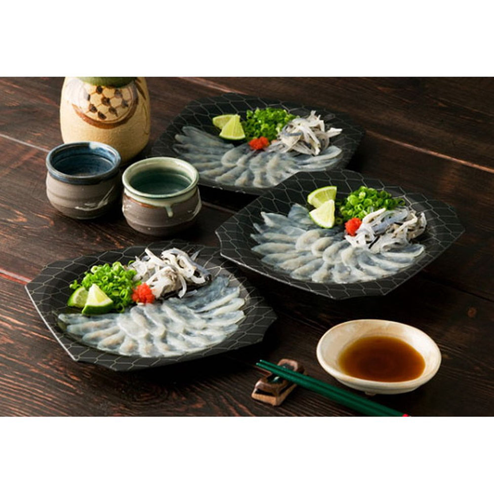 ■内容量:(とらふぐ刺身40g、とらふぐ皮20g、ぽん酢10g、もみじおろし2g、ねぎ)×3皿 22cmプラ皿