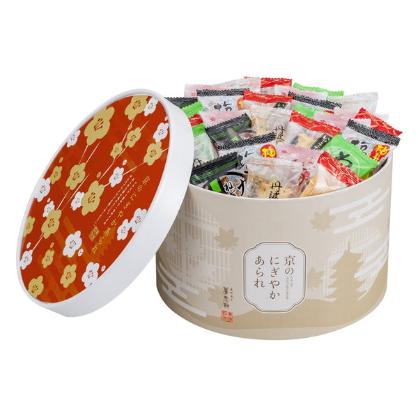 ■和をイメージした可愛いパッケージに、色んな味のあられをいっぱい詰め込みました。ご家族やご友人で楽しめる、にぎやかなギフトです。