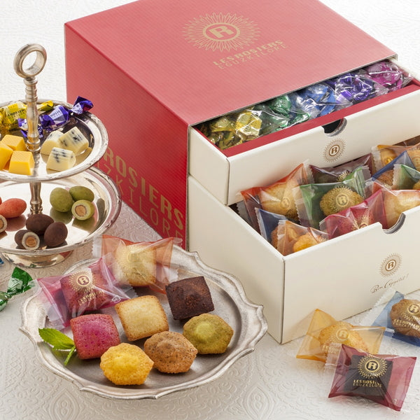 ■引き出しを開けると、ひと口サイズのカラフルなお菓子がたくさん!上の段にはフルーツやティラミスなどの5種類のチョコレート。下の段にはフィナンシェやマドレーヌなどの6種類の焼き菓子が。華やかなギフトボックスに仕上げました。