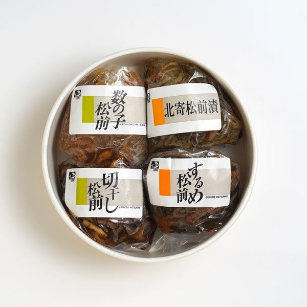 ■商品内容:数の子松前漬、切干松前漬、北寄松前漬、するめ松前漬 各150g×1