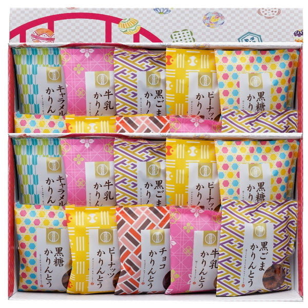 黒ごまかりんとう45g×4個、黒糖かりんとう45g×4個、牛乳かりんとう45g×4個、ピーナッツかりんとう45g×4個、チョコかりんとう45g×2個、キャラメルかりんとう45g×2個