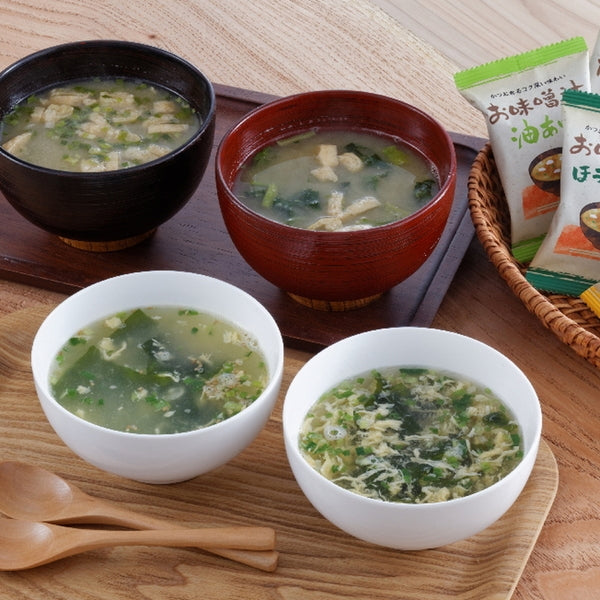 お味噌汁(ほうれん草)×5個、お味噌汁(油あげ)×5個、たまごスープ(和風)×5個、たまごスープ(中華)×5個