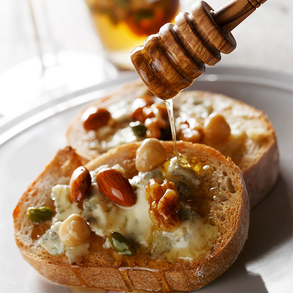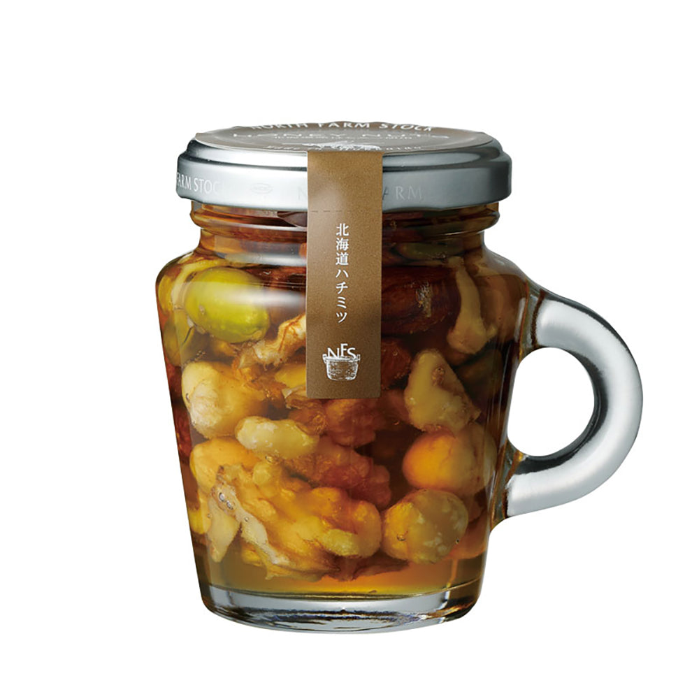 一匹のミツバチが一生をかけて集める蜜の量はわずかティースプーン一杯」 北海道産はちみつにアーモンド、くるみ、ヘーゼルナッツ、ピスタチオなど栄養価の高いミックスナッツをたっぷり漬け込みました。 パンはもちろん、ケーキやアイスクリーム、ヨーグルト、肉料理に相性がとても良いです。特に、ゴルゴンゾーラの塩味と蜂蜜の甘味はぴったりの相性です。