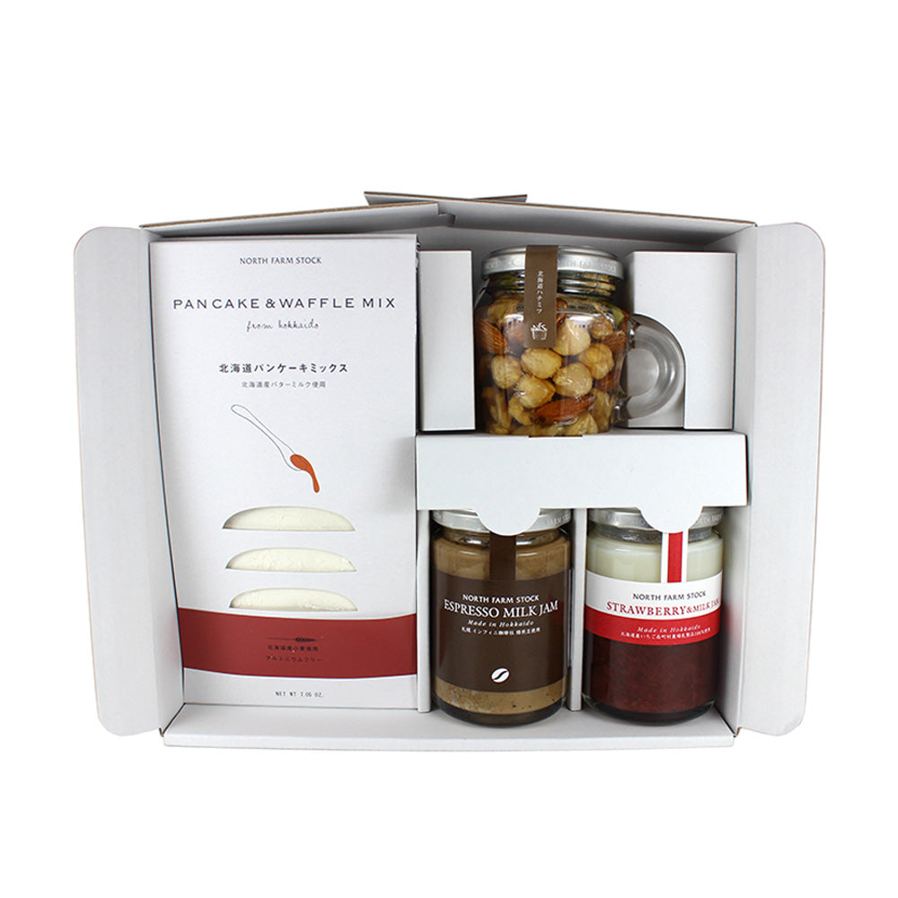 ・北海道パンケーキミックス×1個 ・ハニーナッツ(北海道ハチミツ)×1個 ・エスプレッソミルクジャム×1個 ・ストロベリーミルクジャム×1個