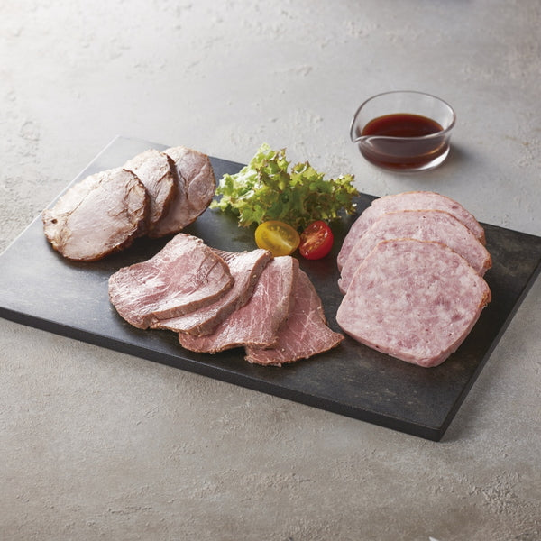 ■商品内容:ローストビーフ(モモ/オーストラリア産)300g×2、焼豚230g・フライッシュケーゼ400g各1、ローストビーフソース付