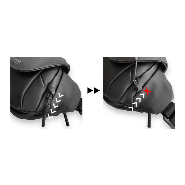 TECH SLING X1のFace1、Face2 コンパートメントのファスナーは一般的なバッグとは逆方向に開閉するようにスライダーを設定しています。