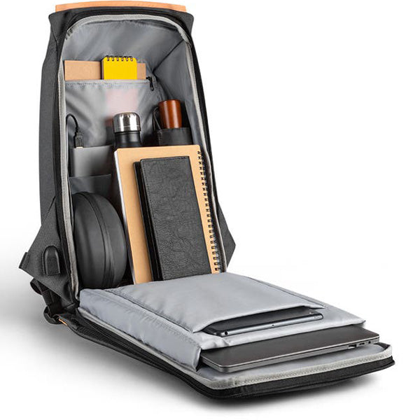 様々な定義がございますが、できるだけ簡単に要約すると「パソコンやスマホをよく使う方に、便利と思ってもらえるデザインやUSB充電機能などを備えた、高機能バッグ。」となります。弊社のプロジェクトでもソーラーパネルを装備したリュックやガジェット類を守る盗難対策設計をしたモデルなど販売しておりますが、それらもスマートバッグです。