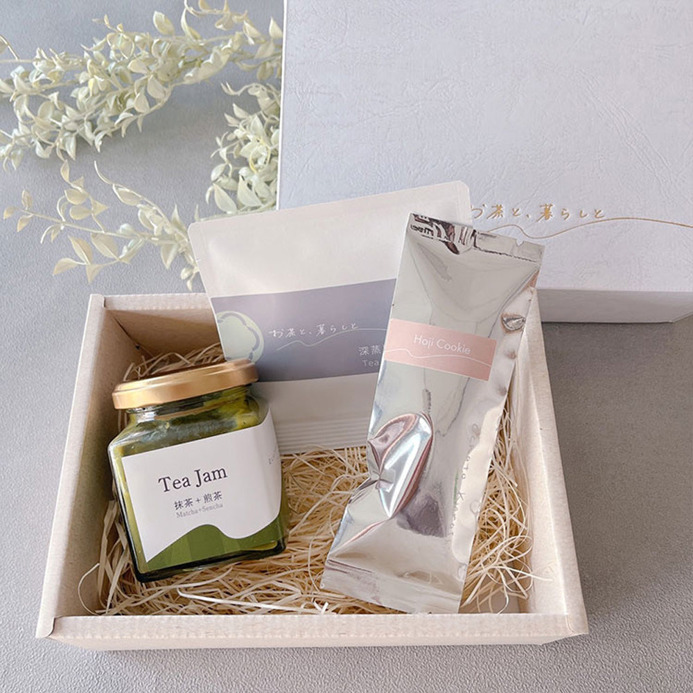 ■商品内容:お茶と、暮らしと お茶尽くしセット Teaミルクジャム130g(抹茶+煎茶)、ほうじ茶クッキー、緑茶ティーバッグ