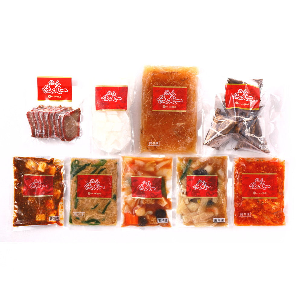 ■商品内容:乾焼蝦仁150g 、本格四川麻婆豆腐 150g 、本格八宝菜 150g 、青椒肉絲 150g 、酢豚 150g 、焼豚スライス 100g 、角煮入りちまき( 4 個) 240g 、魚翅湯(ふかひれ入りスープ) 250g 、杏仁豆腐 500g 各 1P