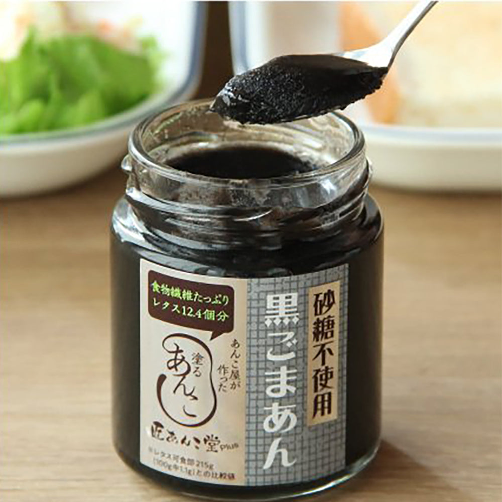 ・黒ごまあん:弊社でも売れ筋の黒胡麻餡。 あん作りのノウハウを生かして食物繊維たっぷりの「ごまあん」を作りました。胡麻に多く含まれるセサミンは、高い抗酸化作用がありアンチエイジングに効果があると言われています。砂糖不使用なので、糖質も低く食物繊維もたっぷりてす。
